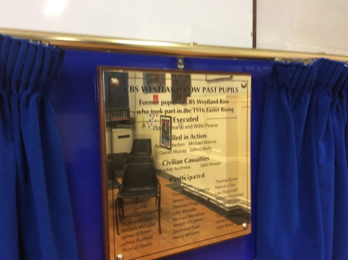Research carried out by the Past Pupils Union revealed that an extraordinary number of past pupils of Westland Row CBS took part in the 1916 Rising. We have been able to establish the names of 36 past pupils who were involved and a specially commissioned bronze plaque bearing their names was unveiled in a ceremony in the school on May 4th. 2016. This date also marked the centenary of the execution of Willie Pearse and after the unveiling ceremony the group attended a special Mass in St. Andrews church. Mass was celebrated by past pupil Monsignor Dan O’Connor and PPU chaplain, Fr. Eugene McCarthy. The Mass was well attended by past pupils, present pupils and teachers. Music and song were provided by Kathryn Smith and Carole O’Connor. The 36 names on the plaque are as follows –
