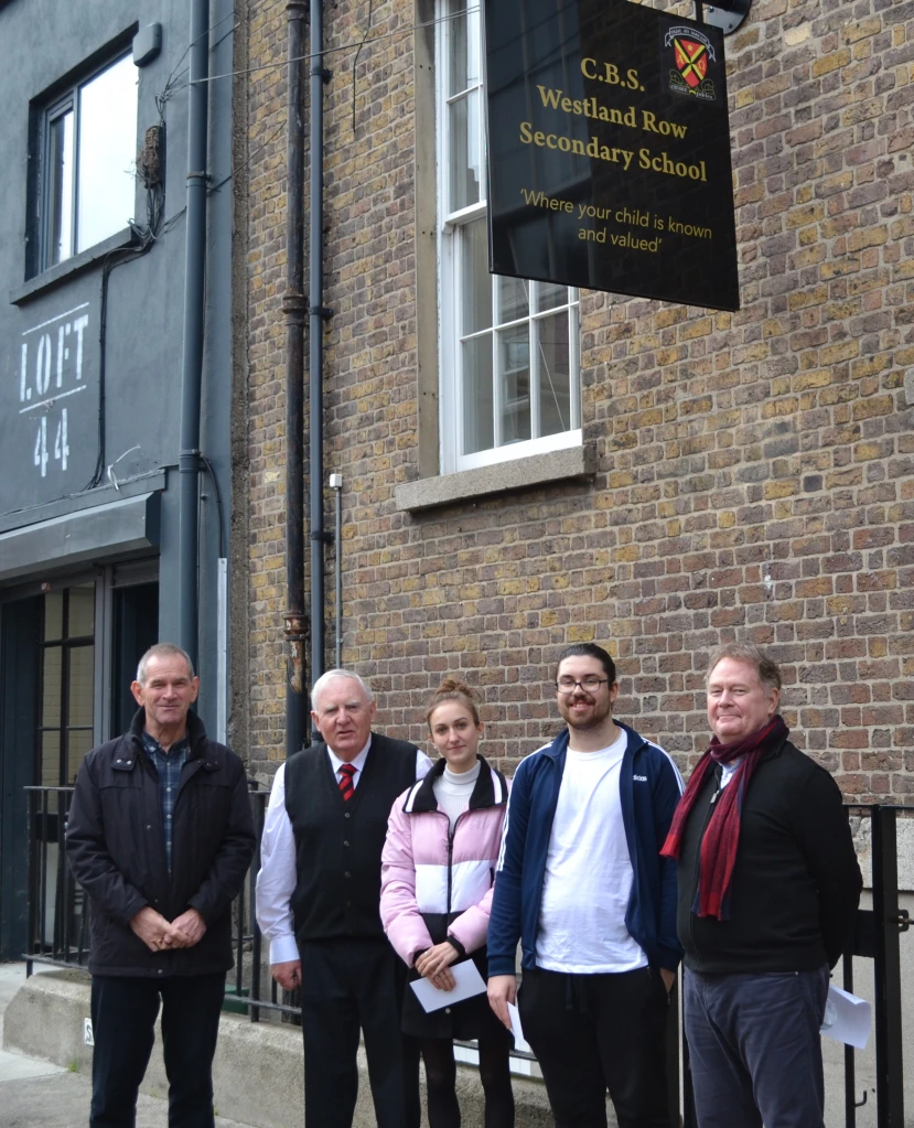 PPU President, Dan, Treasurer, Jim, Genoveva, Kristians and John Davids availing of the good weather to get a photograph outside the school on presentation day.