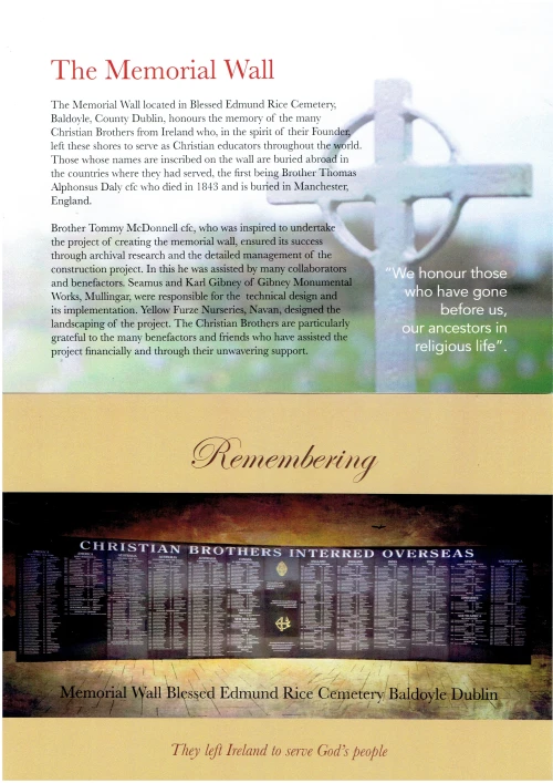 Five or six years ago Brother Tommy McDonnell cfc was inspired to undertake a project to create a Memorial Wall to remember and honour the many young men who joined the Irish Christian Brothers and left Ireland to work in far flung locations in Africa, South America and Asia. Many died and were buried abroad.
